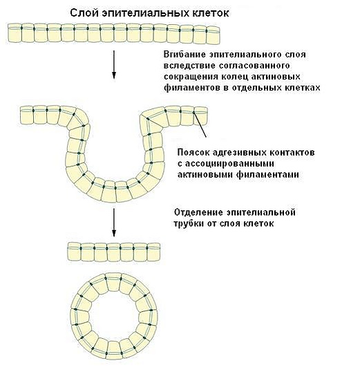 Адгезивные контакты обеспечивают образование широкой межклеточной сети из пучков сократительных актиновых филаментов, расположенных параллельно мембранам клеток и соединенных между собой с помощью белков катенинов и кадгеринов. Такая организация позволяет не только противостоять механическому напряжению, но и согласовывать поведение клеток во время процессов морфогенеза. Например, координированное сокращение колец актиновых филаментов соседних клеток является необходимым для формирования трубок из слоя эпителия, в частности, во время закладки нервной трубки[2]. Одним из примеров является Shroom3-зависимое сокращение зоны прилипания, при этом актин-связывающий белок Shroom3 привлекает к участку адгезионные контакты Rho-киназы и активирует миозин-II, в результате чего и происходит сокращение[4].