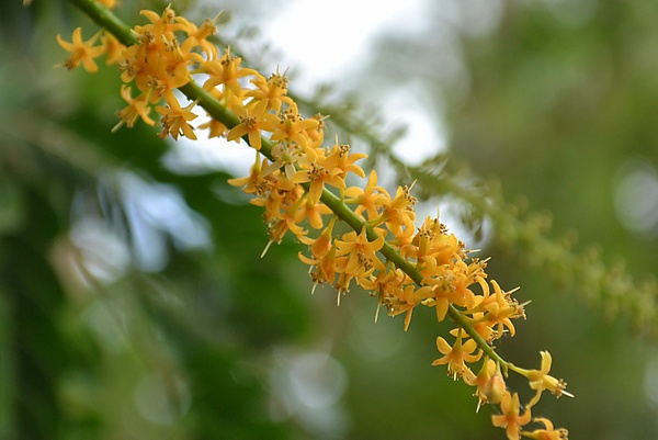 Растение имеет мелкие бледно-жёлтые цветки в форме звезды, имеющие 5 лепестков, сросшихся у основания, и 5 чашелистиков, 10 тычинок, собранные в колосовидные соцветия. У этих цветков весьма ощутимый аромат, напоминающий запах цветков цитрусовых культур.