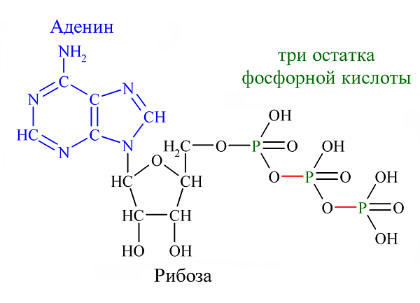 Пуриновое азотистое основание — аденин — соединяется β-N-гликозидной связью с 1'-углеродом рибозы. К 5'-углероду рибозы последовательно присоединяются три молекулы фосфорной кислоты, обозначаемые соответственно буквами: α, β и γ.
