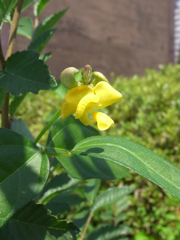 Обоеполые, короткочерешковые цветки зигоморфные с двойным околоцветником[4]. Неравные чашелистики размером 3—4 миллиметра срослись в колокольчатую форму[3] с двумя губами и пятью относительно короткими зубцами[4]. Верхняя губа состоит из двух полностью или частично сросшихся зубцов; нижняя губа состоит из трёх лопастей. Лепестки венчика чаще всего ярко-жёлтые[4] или, реже, лиловые[2]. Венчики длиной от 15[3] до 18 миллиметров имеют типичное строение мотылькового цветка. Нормально развитый парус округлый[4] с выемчатой верхушкой[3]. Продолговатые крылья (вёсла)[4] не имеют шпорца, но имеют короткий ноготок и ушко[3]. Крылья шире лодочки[3]. Слегка изогнутая вправо лодочка в передней части изогнута почти полукругом и имеет роговидный шпорец на левой стороне, у основания имеет ноготок[4][3]. Десять фертильных тычинок не срослись с лепестками. Девять тычиночных нитей срослись в трубку[4]. На диске имеются нектарные железы. Единственный продолговатый[3] верхний плодолистик коротко опушён[4]. Изогнутый[3] столбик[4] опушён и сверху с одной стороны бородатый, несколько боковое рыльце дисковидное.