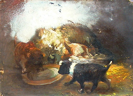 На полотне представлены щенки, пьющие воду из большой мелкой тарелки. В центре первого плана выделяется чёрный щенок с белыми ушами и белым ошейником. Слева изображён рыжевато-коричневый щенок, а на заднем плане находится взрослая собака с пушистой золотисто-охристой шерстью. Справа в композиции видна золотистая солома. Работа выполнена в жанре анималистика, с акцентом на деталях внешности животных и их окружения, что подчёркивает особенности композиции.