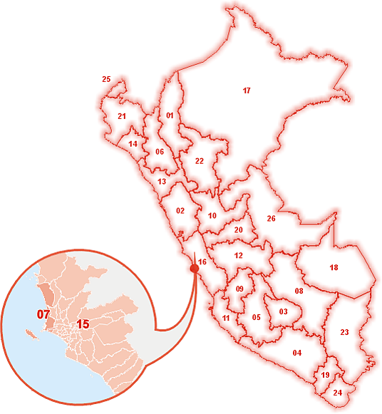 Административное деление Перу менялось время от времени, начиная с того момента, когда государство получило независимость от Испании в начале XIX века. Старые провинции были переформированы, либо ликвидированы по разным причинам. До 2002 года государство делилось на 24 департамента — до образования новых регионов. 18 ноября 2002 года, в соответствии с вышедшим указом, территория была поделена на 26 административных единиц — 25 регионов и провинцию Лима. Эти регионы образованы из провинций, которые, в свою очередь, состоят из районов. Таким образом, в Перу 196 провинций и 1845 районов. Столичная агломерация образует отдельную провинцию, имеющую почти тот же статус, что и у остальных административных единиц Перу первого уровня, но при этом она входит в состав другого одноимённого региона.