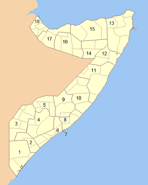 | Банадир | Banaadir | Могадишо | Абдулъасис, Бондере, Дайниле, Каран, Уабери, Уададжир, Уардиглей, Хамар-Джабджаб, Хмар-Уэйне, Хаульуадаг, Ходан, Шибис, Шингани, Якшид |