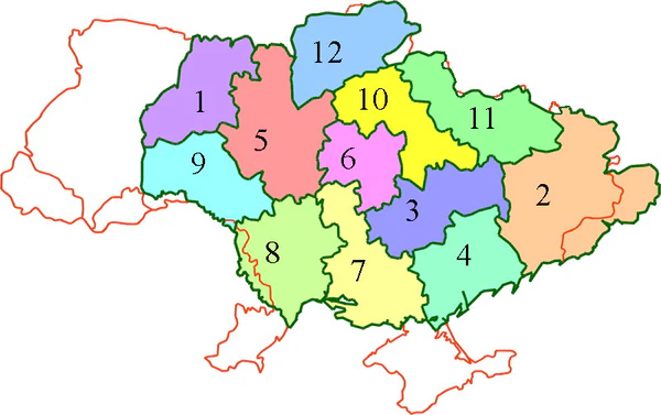 - Волынская область (центр — Луцк, 28 районов);