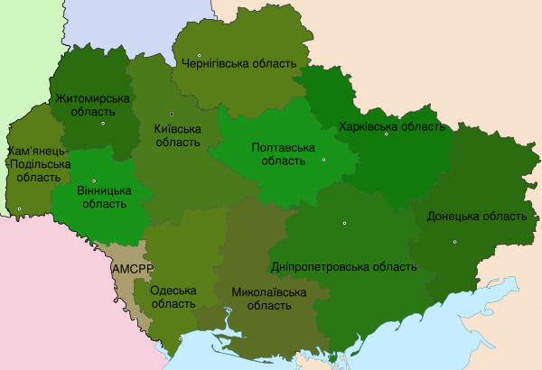 - Херсонская область (созданная 30 марта 1944 года из частей Николаевской и Запорожской областей)