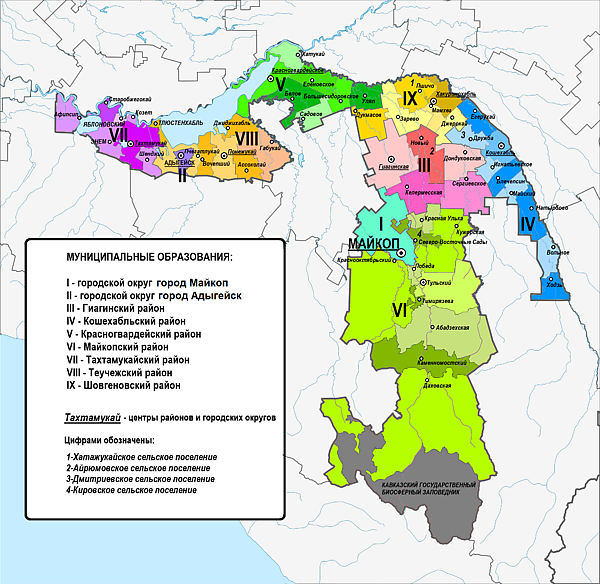 | 4 | Тахтамукайский | аул Тахтамукай | Афипсипский, Гатлукайский, Козет, Лакшукайский, Новобжегокайский, Пчегатлукайский, Старобжегокайский, Тахтамукайский, Шенджийский, Яблоновский |