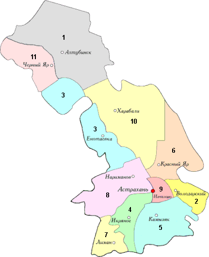 Согласно Закону «Об административно-территориальном устройстве Астраханской области» , субъект РФ включает следующие административно-территориальные единицы[1][2]:
