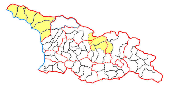 Территория Абхазской Автономной Республики, а также территория бывшей Юго-Осетинской автономной области, формально ставшая частями территорий краёв Шида-Картли, Мцхета-Мтианети, Рача-Лечхуми и Нижняя Сванетия и Имеретия, контролируются частично признанными государствами Республика Абхазия и Южная Осетия соответственно.
