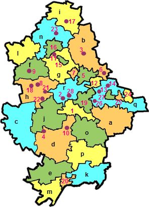 Районы: a — Амвросиевский, b — Артёмовский, c — Великоновосёлковский, d — Волновахский, e — Володарский, f — Добропольский, g — Константиновский, h — Красноармейский, i — Краснолиманский, j — Марьинский, k — Новоазовский, l — Александровский, m — Першотравневый, n — Славянский, o — Старобешевский, p — Тельмановский, q — Шахтёрский, r — Ясиноватский.