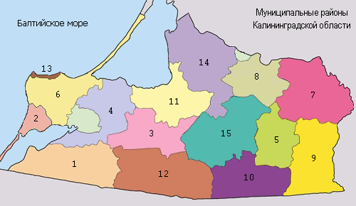 - 15 муниципальных районов (Багратионовский, Балтийский, Гвардейский, Гурьевский, Гусевский, Зеленоградский, Краснознаменский, Неманский, Нестеровский, Озёрский, Полесский, Правдинский, Светлогорский, Славский, Черняховский).