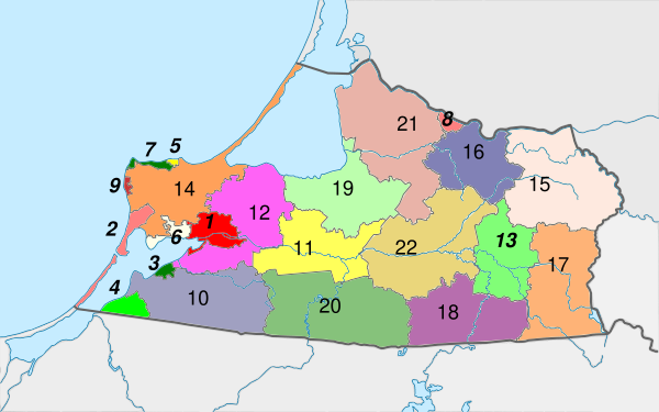 - административные районы: Багратионовский; Балтийский; Гвардейский; Гурьевский; Гусевский; Зеленоградский; Краснознаменский; Неманский; Нестеровский; Озерский; Полесский; Правдинский; Светлогорский; Славский; Черняховский.