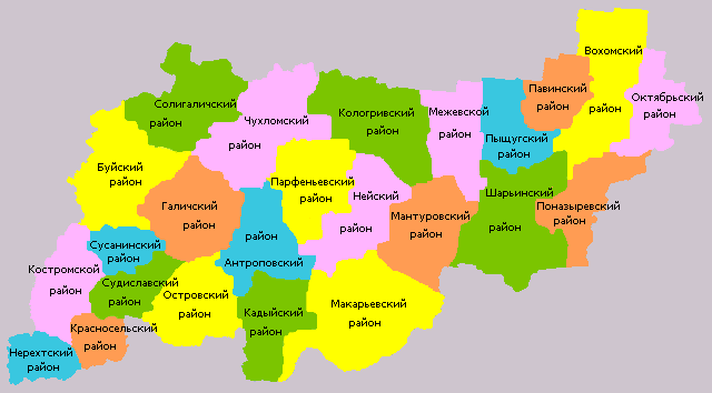 - 8 городов областного значения (Буй, Волгореченск, Галич, Кострома, Мантурово, Нея, Нерехта, Шарья);