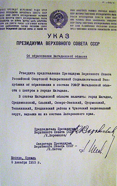 Магаданская область в составе РСФСР была образована Указом Президиума Верховного совета СССР 3 декабря 1953 года с центром в городе Магадане. В состав области были включены: шесть районов, выделенных из Хабаровского края, Чукотский национальный округ (см. далее АТД Чукотского АО) и часть территории Корякского национального округа (Верхнепариньский, Гижигинский Тайгоносский сельсоветы Пенжинского района). В состав области вошли следующие районы: