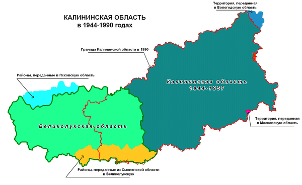 2 октября 1957 года Великолукская область была ликвидирована и западная её половина была включена в состав Псковской области. Восточная часть упразднённой Великолукской области (Бельский, Жарковский, Ильинский, Ленинский, Нелидовский, Октябрьский, Пеновский, Серёжинский и Торопецкий районы) вошла в состав Калининской (ныне — Тверской) области.