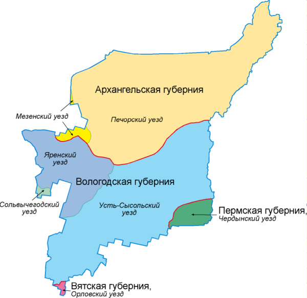 Летом 1918 года Усть-Сысольский, Яренский и Сольвычегодский уезды отошли к новообразованной Северо-Двинской губернии. При этом восточные волости Усть-Сысольского уезда, охватывающие верховья Печоры, были переданы в Чердынский уезд Пермской губернии, а Пысская волость Мезенского уезда была передана в новый Усть-Вашский уезд[28].