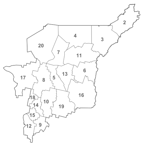 городские округа: 1 Сыктывкар, 2 Воркута, 3 Инта, 4 Усинск, 5 Ухта, 6 Вуктыл; муниципальные районы: 7 Ижемский, 8 Княжпогостский, 9 Койгородский, 10 Корткеросский, 11 Печора, 12 Прилузский, 13 Сосногорск, 14 Сыктывдинский, 15 Сысольский, 16 Троицко-Печорский, 17 Удорский, 18 Усть-Вымский, 19 Усть-Куломский, 20 Усть-Цилемский.