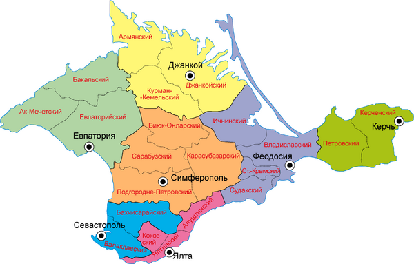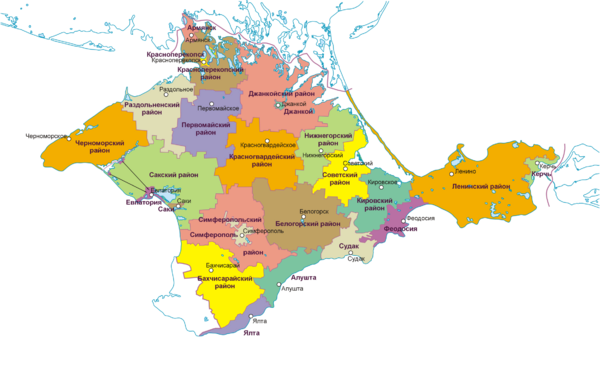 14 декабря 1944 года 11 районов Крыма были переименованы: Ак-Мечетский — в Черноморский, Ак-Шеихский — в Раздольненский, Биюк-Онларский — в Октябрьский, Ичкинский — в Советский, Карасубазарский — в Белогорский, Колайский — в Азовский, Лариндорфский — в Первомайский, Маяк-Салынский — в Приморский, Сейтлерский — в Нижнегорский, Тельманский — в Красногвардейский, Фрайдорфский — в Новосёловский.