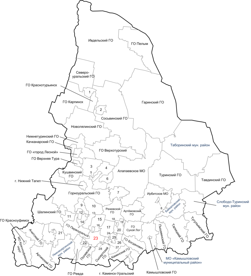 Муниципальное деление Свердловской области (на 1 января 2006 года): городские округа (ГО) и муниципальные районы. Обозначения: 1 — Волчанский ГО, 2 — Серовский ГО, 3 — ГО Красноуральск, 4 — Верхнесалдинский ГО, 5 — ГО ЗАТО Свободный, 6 — ГО «Нижняя Салда», 7 — МО г. Алапаевск, 8 — МО г. Ирбит, 9 — Кировградский ГО, 10 — Невьянский ГО, 11 — ГО Староуткинск, 12 — ГО Верхний Тагил, 13 — ГО Верх-Нейвинский, 14 — Новоуральский ГО, 15 — ГО Верхняя Пышма, 16 — ГО Среднеуральск, 17 — Берёзовский ГО, 18 — Малышевский ГО, 19 — ГО Рефтинский, 20 — Асбестовский ГО, 21 — Бисертский ГО, 22 — ГО Дегтярск, 23 — МО «город Екатеринбург», 24 — ГО Верхнее Дуброво, 25 — ГО Заречный, 26 — Белоярский ГО, 27 — МО «посёлок Уральский», 28 — Арамильский ГО