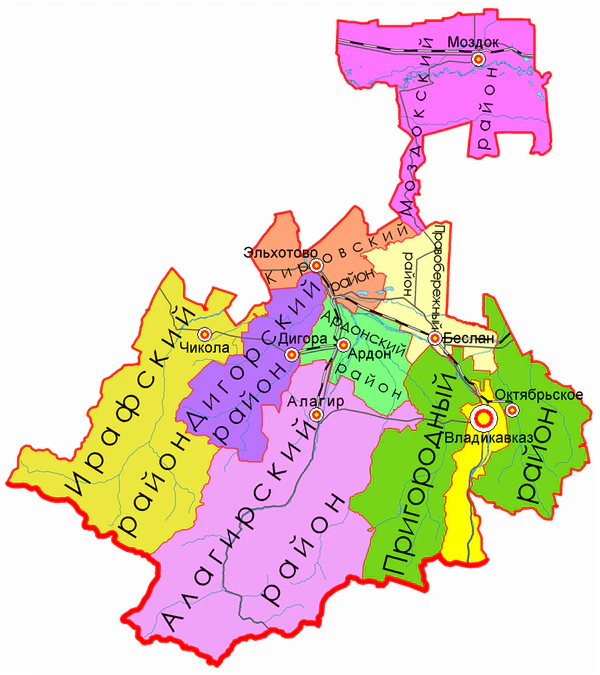 К началу 1932 года Северная Осетия включала 5 районов: Алагиро-Ардонский, Дзауджикауский, Дигорский, Правобережный и Притеречный. В 1934 году Северо-Осетинская АО получила статус АССР. В том же году был упразднён Притеречный район, но в том же и следующем годах образованы сразу 3 района — Горно-Алагирский, Ирафский и Эльхотовский (вскоре переименован в Кировский). Дзауджикауский район был переименован в Орджоникидзевский.