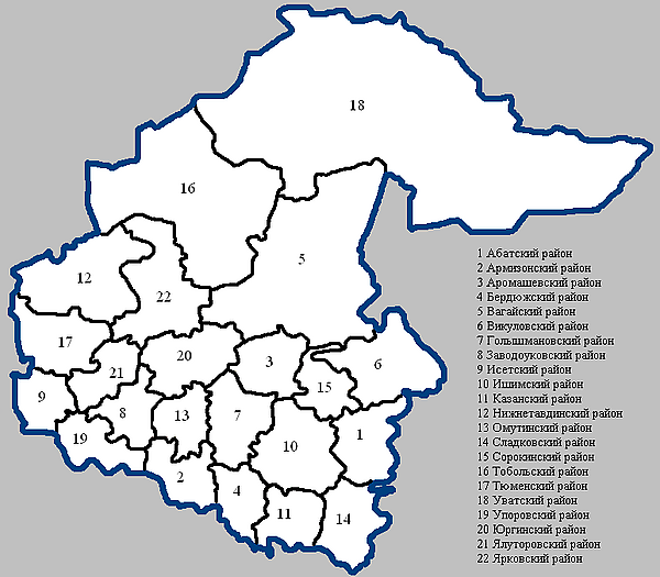 Согласно Закону «Об административно-территориальном устройстве Тюменской области», субъект РФ включает:[1]