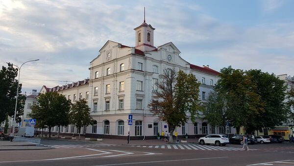 Здание было построено в 1952 году. Кирпичный, 4-этажный со стороны улицы Гетмана Полуботка и 3-этажный со стороны проспекта Мира, Г-образный в плане дом. Фасад асимметричный, направлен на юг к Красной площади. Фасад с выступающим в сторону площади ризалитом, завершается с двух сторон фронтонами в стиле барокко, в которых установлены часы; над крышей нарастает бельведер (башня) — четверик, увенчанный шпилем. Фасад 3-этажной секции завершается боковым фронтоном (с северной стороны), а торцы здания также завершаются фронтонами. Фасад украшен пилястрами. Окна 2-го этажа увенчаны прямыми сандриками на кронштейнах. С северной стороны к зданию примыкает дом № 27 проспекта Мира, а с восточной — дом № 4 улицы Гетмана Полуботка.