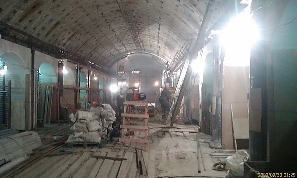 - Декабрь. Стена соседнего дома укреплена, начаты работы по сооружению котлована. На самой станции производился монтаж зонтов в боковых тоннелях.