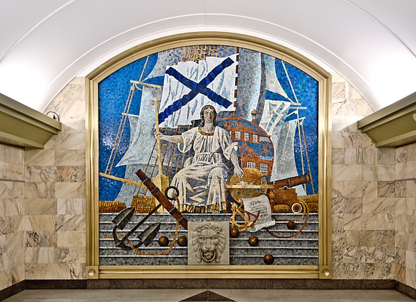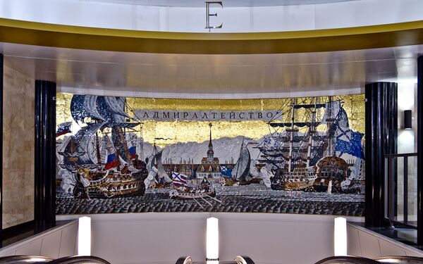 Торец центрального зала станции украшает мозаичное панно «Основание Адмиралтейства» (художник А. К. Быстров). Торец пешеходного коридора между большим и малым наклонными ходами украшен мозаичным панно «Нева», а в пространстве над гермозатвором, долженствующем разделять пешеходный коридор в его центре, установлено мозаичное панно «Нептун» (художник А. К. Быстров).