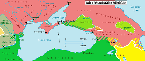 - Турция признавала переход к России Картли-Кахетинского царства, Имеретии, Мингрелии, Гурии, а также части Восточной Армении (Эриванского и Нахичеванского ханств), переданных Персией по Туркманчайскому мирному договору[5][6][7];