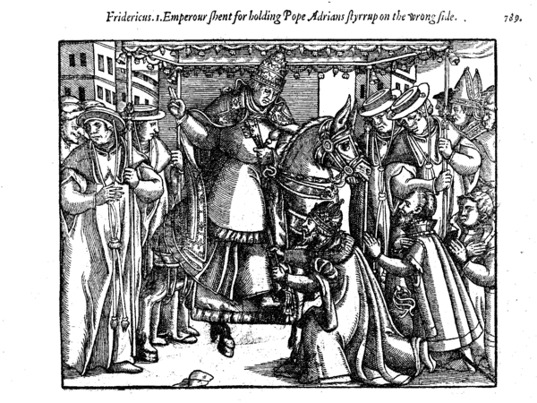 9 июня 1155 года в Кампо-Грассо состоялась первая личная встреча Адриана IV и Фридриха Барбароссы, закончившаяся громким провалом. По этикету король должен был взять папскую лошадь под уздцы и придерживать стремя, пока папа не спешится; после этого король должен был поцеловать папскую туфлю, и только затем папа даровал монарху лобзание мира. Из всех положенных церемоний Фридрих I согласился лишь поцеловать туфлю, и разгневанный папа отказался лобзать короля. Адриан IV заявил, что все предшествовавшие императоры всегда исполняли церемонию в знак свидетельства почтения к апостолам Петру и Павлу, преемниками которых являются папы; пока церемония не будет исполнена в полном объёме, переговоры состояться не могут. «Конфликт у лошадиной морды» продолжался два дня, и только 11 июня Фридрих I выказал требуемые знаки почтения. Исчерпав конфликт, стороны быстро пришли к соглашению: папа и монарх взаимно обязались не вступать в сепаратные переговоры с римским сенатом, византийским императором Мануилом I и сицилийским королём Вильгельмом Злым; Фридрих обещал защищать интересы папы, а Адриан IV — отлучить от Церкви всех противников монарха, которые после трёх предупреждений не сложат оружия. По достижении согласия Адриан IV и Фридрих I отправились в Рим.