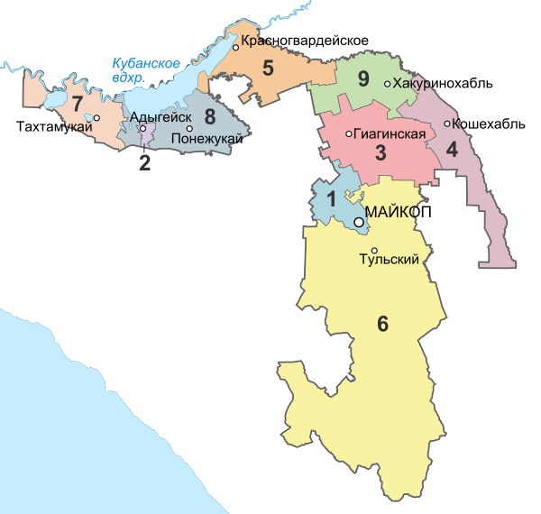 Входит в состав Южного федерального округа, является частью Северо-Кавказского экономического района[10]. Столица — город Майкоп.