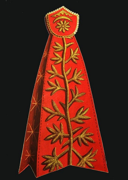 В национальном костюме золотой вышивкой украшали рукава, борта платья, углы кафтанчика, а также донышко и околыш женской шапочки. Вышивка выполнялась вприкреп или гладью; из золотых нитей ткали галуны и плели шнуры, которые затем использовали как элементы узора. Для любых видов шитья использовали трафареты из бумаги или картона, которые мастерицы изготавливали сами, передавая орнаменты из поколения в поколение. Для вышивки вприкреп трафарет мог использоваться многократно, поскольку служил только для нанесения контуров узора. При вышивке гладью трафарет оставался под шитьём.