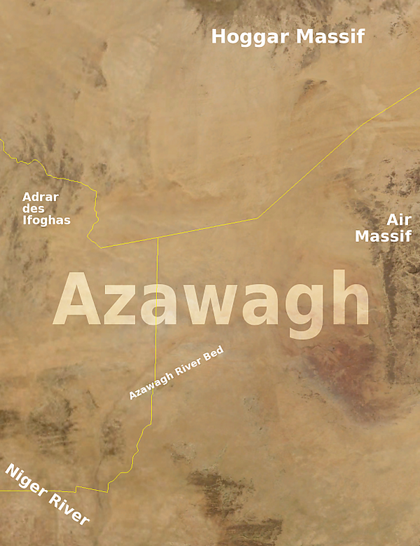 Обширный регион расселения туарегов, включающий Малийский Азавад (Мали), юго-восток Алжира, запад Нигера, север Буркина-Фасо и юго-запад Ливии, называется Азауаг (Azawagh, сочетание gh произносится как фрикативное «г»).