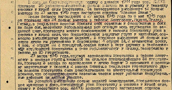 «С декабря 1944 года тов. Азаров произвел 36 успешно-выполненных боевых вылетов на штурмовку и разведку техники и живой силы противника. За качественное выполнение 12 боевых вылетов по 27 марта 1945 года награждён орденом «Красное Знамя».