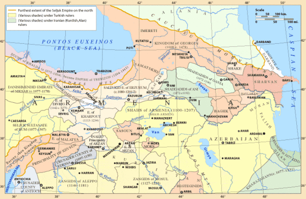 С конца XII века войска усилившегося Грузинского царства под началом армянского княжества Закарянов и при поддержке местного армянского населения освобождают Восточную Армению от власти тюрок-сельджуков. Армянское княжество Закарянов (включающее междуречье Куры и Аракса — запад нынешнего Азербайджана) под сюзеренитетом Грузии просуществовало до нашествия монголов в середине XIII века.