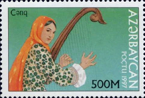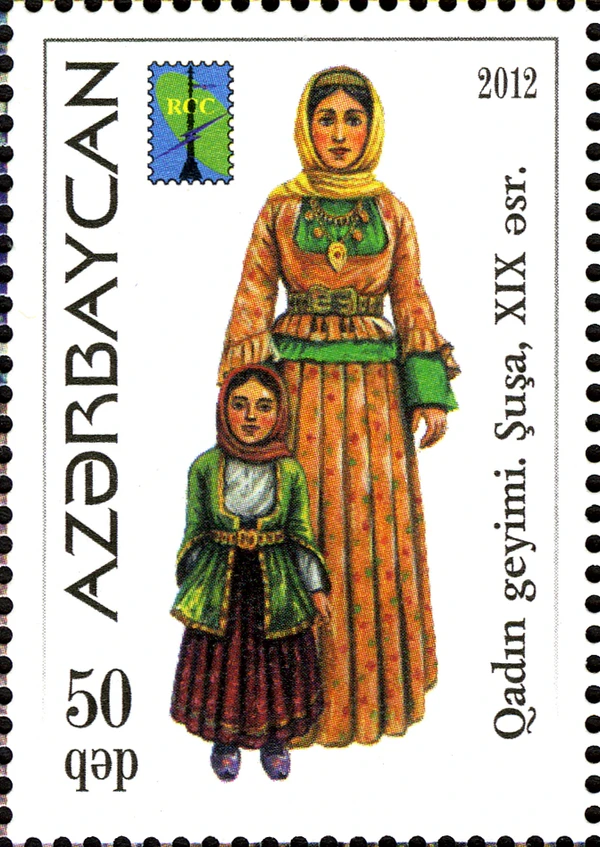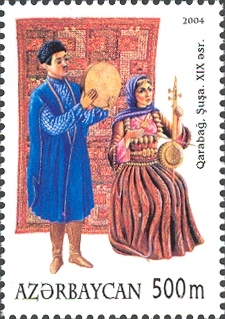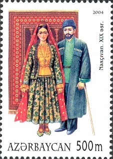 Почтовые марки Азербайджана 2004 года с изображением костюмов XIX столетия. Слева направо: Баку, Карабах (Шуша), Нахичевань, Шемахы