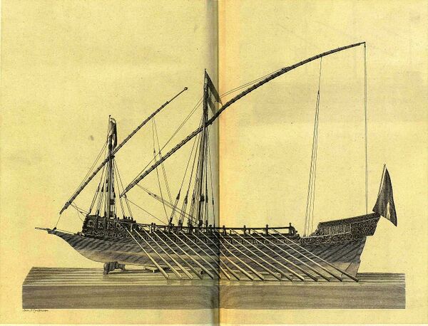 В 1694 году по приказу Петра I, возможно, перед его отъездом из Архангельска, но не позже его возвращения в Москву, в Голландской республике была заказана 32 вёсельная галера, части которой со всеми принадлежностями должны были доставить в Архангельск в следующем году, а оттуда, скорее всего, на Волгу и в Каспийское море[3]. Назначение этой галеры изменили политические обстоятельства. Она должна была стать моделью для постройки 22 подобных ей галер.