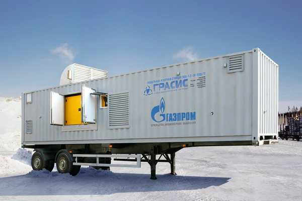 Установка азотного пожаротушения может быть выполнена в контейнерном варианте на базе салазок или шасси.