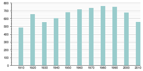 Из 268 домашних хозяйств 44,0 % представляли собой совместно проживающие супружеские пары (13,4 % с детьми младше 18 лет), в 7,1 % домохозяйств женщины проживали без мужей, в 2,6 % домохозяйств мужчины проживали без жён, 46,3 % не имели семьи. В среднем домашнее хозяйство вели 1,99 человека, а средний размер семьи — 2,74 человека. Население города по возрастному диапазону распределилось следующим образом: 18,8 % — жители младше 18 лет, 2,0 % — между 18 и 21 годами, 50,9 % — от 21 до 65 лет и 28,3 % — в возрасте 65 лет и старше. Средний возраст населения — 49,5 года. На каждые 100 женщин приходилось 81,5 мужчины, при этом на 100 совершеннолетних женщин приходилось уже 81,6 мужчин сопоставимого возраста[4].