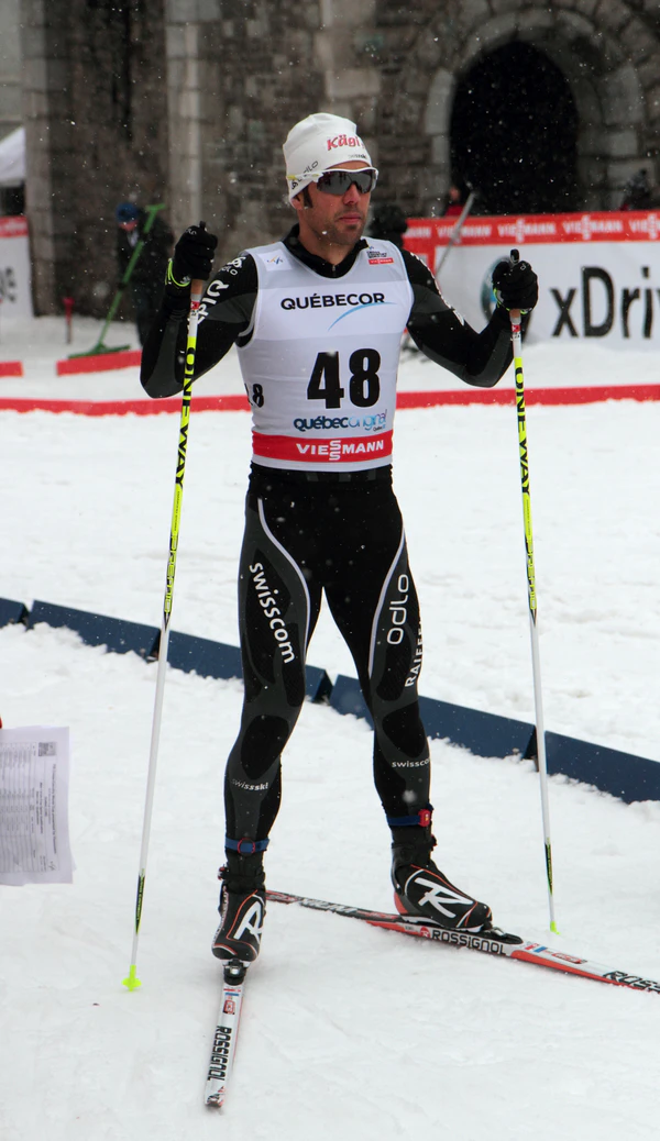 Использует лыжи и ботинки производства фирмы Rossignol.