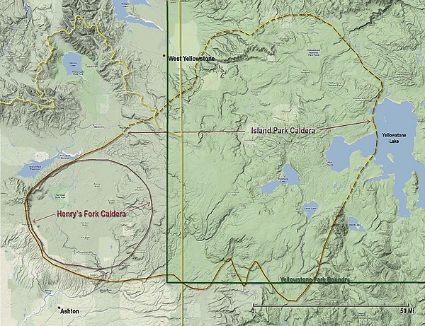 К югу-западу от кальдеры лежит плато Снейк-Ривер, восточная часть которого образовалась в результате сдвига Йеллоустонской горячей точки в северо-восточном направлении, происходившего на протяжении 17 миллионов лет[4]. Центральная и восточная долины плато состоят из толстых слоев вулканического туфа, покрытых тонким слоем базальта. К другим объектам вулканического происхождения на плато относятся, например, Лунные кратеры. Из кальдеры видны горные пики хребта Титон, который находится к юго-востоку от Айленд-Парк.