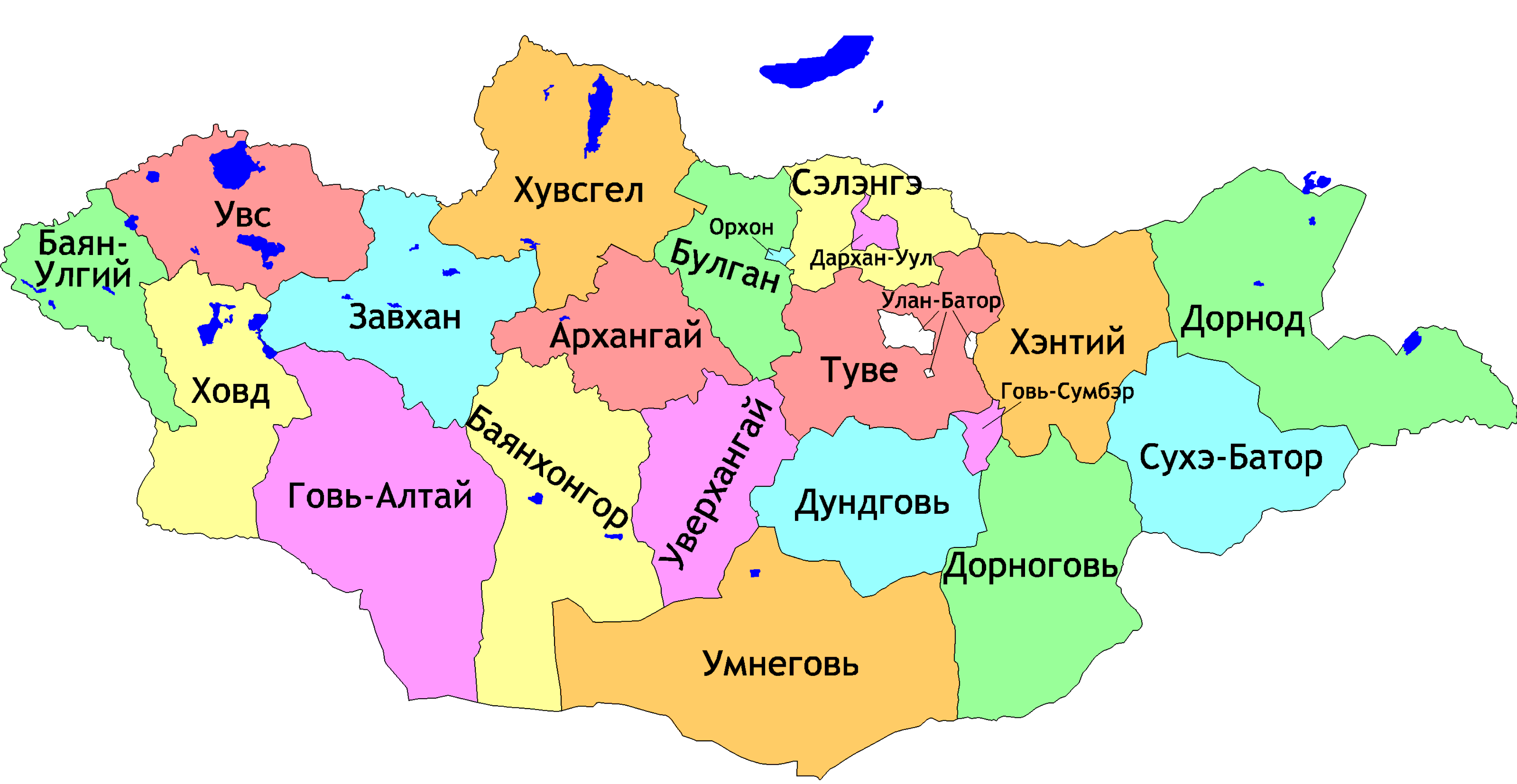 - Отдельные области — Дархан-Уул, Говь-Сумбэр, Орхон (аймак).
