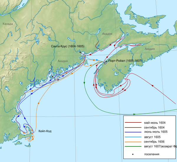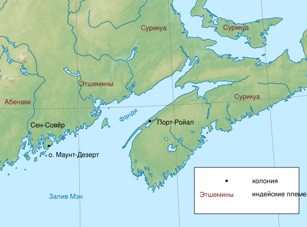 Первое французское поселение было основано Пьером Дюгуа, губернатором Акадии под властью короля Генриха IV, на острове Сан-Круа в 1604 году. Вскоре король отказал Пьеру Дюгуа в королевской пушной монополии, объясняя это недостаточностью приносимых ею доходов, и колонисты оказались на самообеспечении, будучи лишёнными поддержки монарха. С минимальной королевской властью акадийцы практиковали деревенское самоуправление.