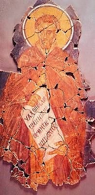 - фреска в церкви Спаса Преображения на Ковалёве в Новгороде (1380 год). В руку святому на изображении помещён свиток со словами: «Чадо послушания не умирает николиже».