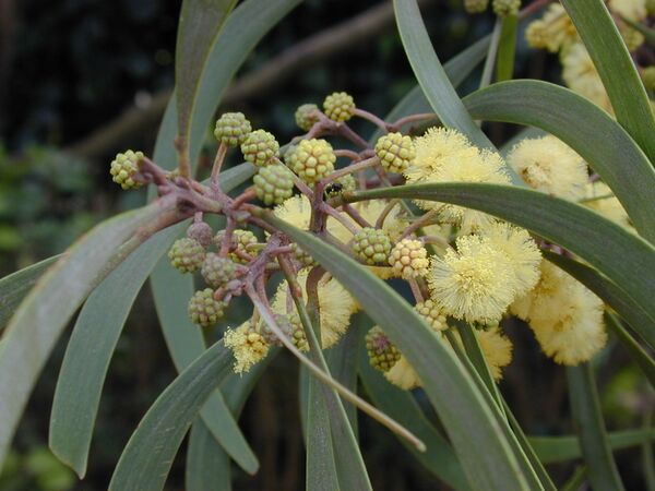 Листья филлодные длинные, узкие, прямые или серповидные, плотные, серовато-зелёные. Молодые листья — перистые сложные.