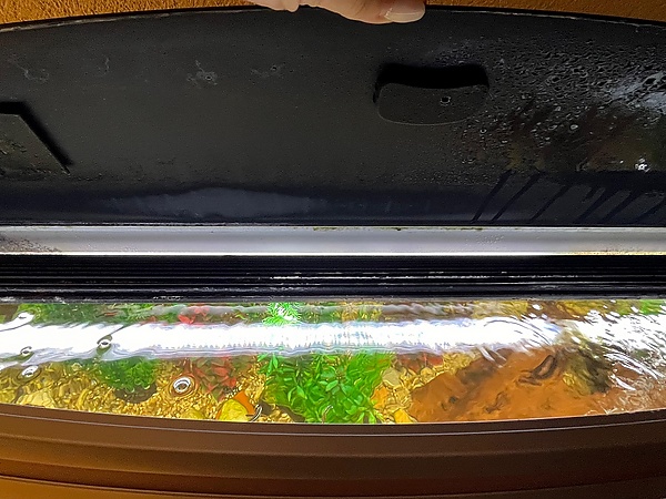 Аквариумное освещение является не только предметом дизайна, оно необходимо для жизни и развития водных живых растений для выстраивания и работы естественной биологической фильтрации. Неправильно настроенный свет и отсутствие режима освещения может привести к неблагоприятным последствиям. Существует несколько видов приборов для организации аквариумного освещения: лампы накаливания, люминесцентные лампы, светодиодные приборы. Чаще всего приборы искусственного освещения размещаются на верхней крышке аквариума, режим должен быть максимально приближен к световому дню — это важно для растений и полноценной жизнедеятельности обитателей аквариума, формирования и развития аквариумной экосистемы[4].