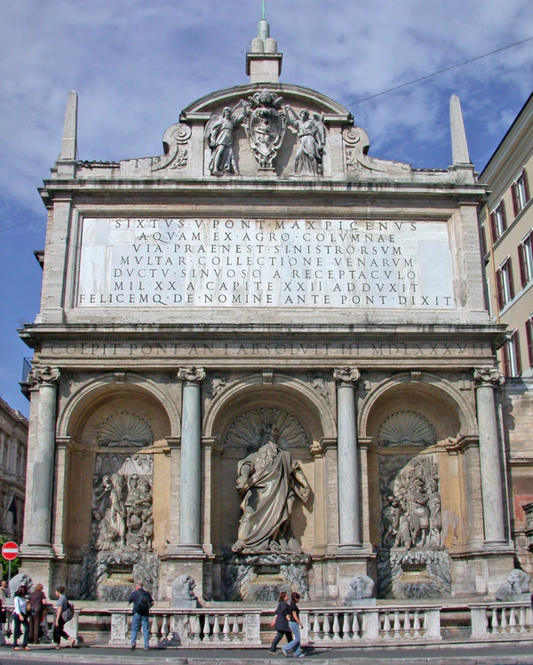 К началу правления папы Сикста V (урождённого Феличе Перетти ди Монтальто), в 1585 году, функционировал лишь один из одиннадцати римских акведуков, Аква Вирго. За питьевой водой жителям Рима приходилось ходить к единственному фонтану, который располагался неподалёку от нынешнего фонтана Треви. Сикст V принял решение восстановить другие акведуки, в частности Аква Александрина, который переименовал в свою честь в Аква-Феличе. Воздвигнутый в конце акведука фонтан стал первым монументальным фонтаном Рима со времен античности[2].