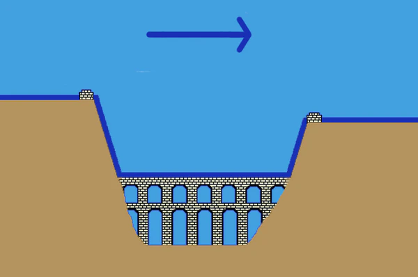 Там, где необходимо было пересечь особенно глубокие или длинные углубления, дюкеры (перевернутые сифоны) можно использовать вместо арочных опор. Принцип дюкера прост. В водопропускной трубе жидкость может преодолеть препятствие без использования насосов. Используется принцип сообщающихся трубок, согласно которому жидкости в соединенных трубках всегда выровнены до одного уровня. Если новая жидкость всегда поступает с одной стороны, то она достигает того же уровня с другой стороны и может протекать там практически без потери и при той же высоте.