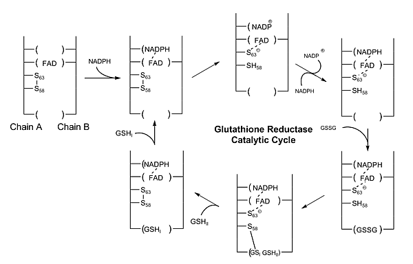 Роль глутатиона (GSH) заключается в удалении накопленных активных форм кислорода, которые могут повреждать клетки. Во время этого процесса его тиоловая боковая цепь окисляется, и две молекулы глутатиона соединяются дисульфидной связью с образованием димера (GSSG). Чтобы регенерировать глутатион, необходимо разорвать дисульфидную связь. В клетках человека это осуществляется глутатионредуктазой (GR).