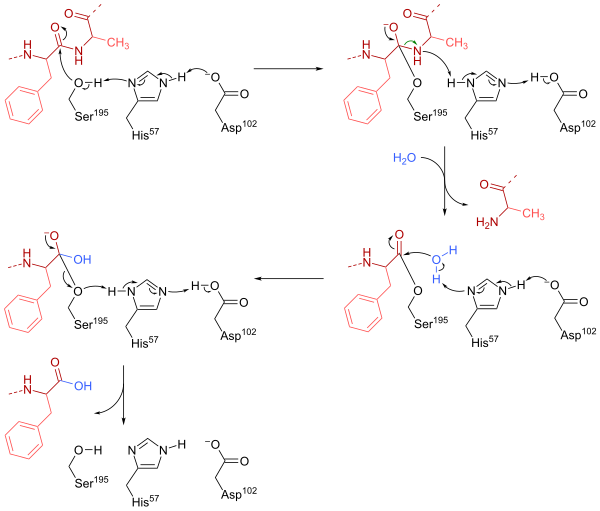 Механизм действия химотрипсина можно разделить на две фазы. Во-первых, Ser-195 нуклеофильно атакует углерод пептидной связи в субстрате с образованием тетраэдрического промежуточного соединения. Нуклеофильность Ser-195 усиливается His-57, который отрывает протон от Ser-195 и, в свою очередь, стабилизируется отрицательно заряженной карбоксилатной группой (RCOO-) в Asp-102. Кроме того, промежуточный тетраэдрический оксианион, образующийся на этой стадии, стабилизируется водородными связями из Ser-195 и Gly-193.