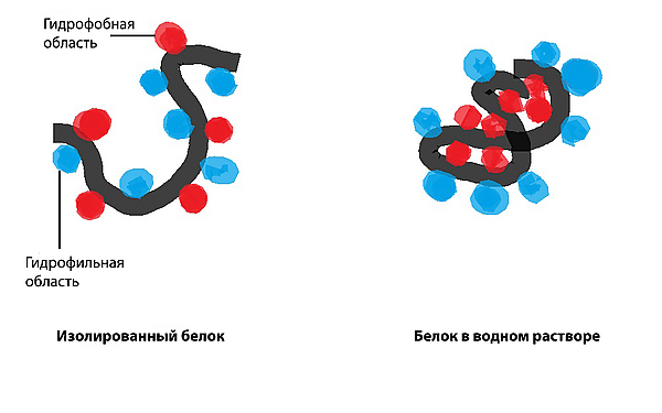 Гидрофобное взаимодействие: неполярные гидрофобные группы имеют тенденцию агрегироваться вместе в водной среде и пытаться уйти из полярного растворителя. Эти гидрофобные группы обычно имеют длинную углеродную цепь и не реагируют с молекулами воды. При растворении в воде молекула белка сворачивается в шарообразную форму, оставляя гидрофильные группы снаружи, в то время как гидрофобные группы погружаются глубоко в центр.